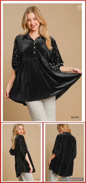 Umgee Velvet Top with Pearled Sleeves