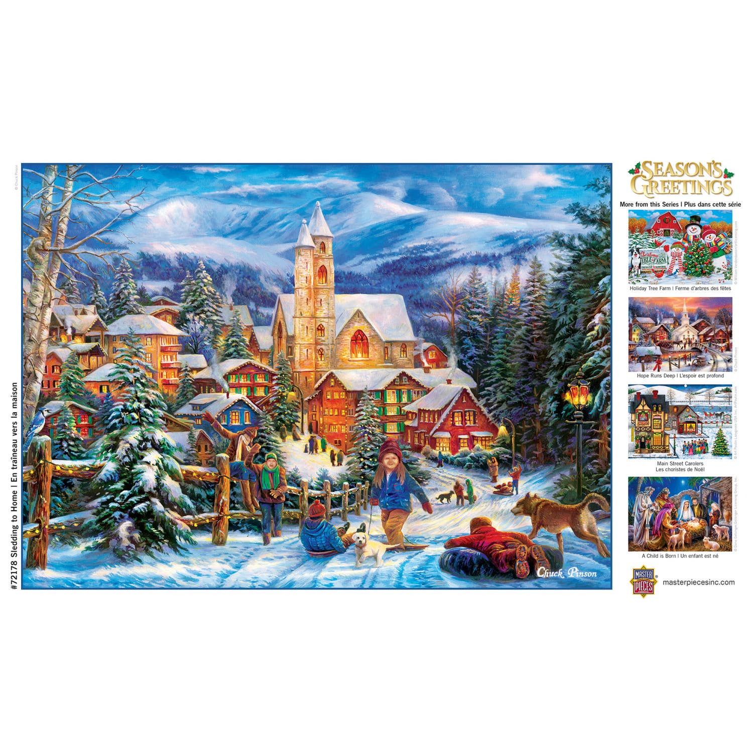 These MasterPieces 19.25" x 26.75" 1000pc of Home for the Holidays features kids sledding into town while the townsfolk finish last minute shopping . Holiday Puzzles are the perfect way to get into the holiday spirit, and the perfect holiday presents for friends and family. Cozy up around the table for some holiday family fun! To reduce their impact on our environment, the chipboard used in these puzzles is made of 100% recycled material.